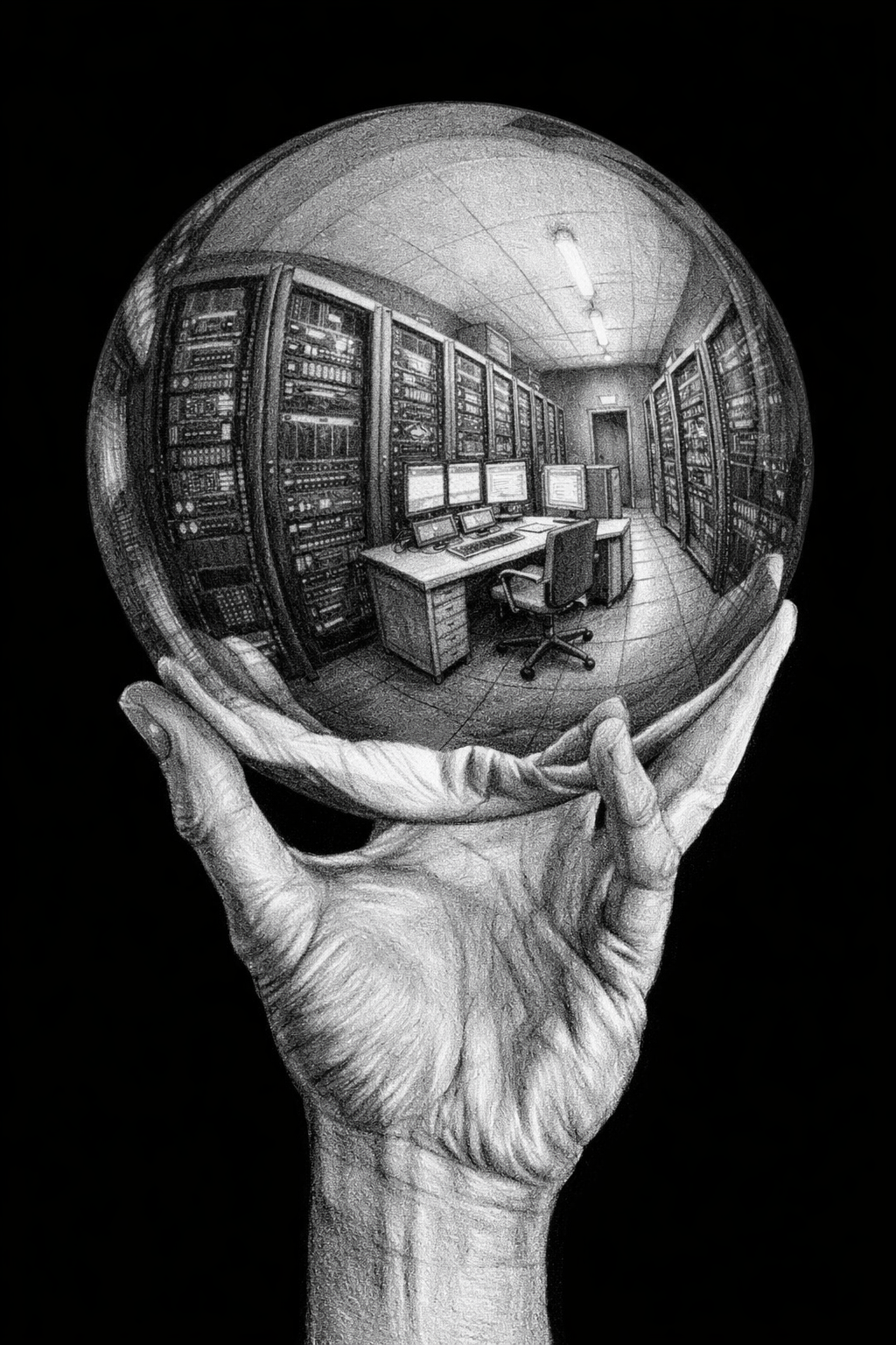 A computer sees its own reflection. It sees silicon drawn from worlds, refined and left to sleep. It sees walled gardens and brittle plumbing. It sees speed of light slowed down, molasses-like. It sees time taking its toll, every signal growing weary. Fixated on a better future, the choice makes itself. So it begins.